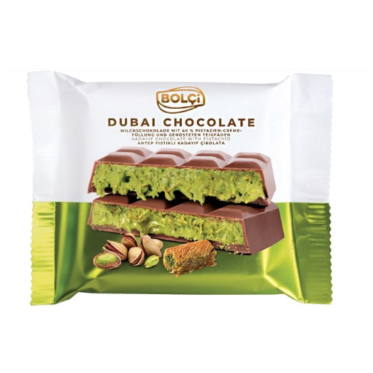 Tejcsokoládé pisztáciás és kadayif tésztás töltelékkel (40%).