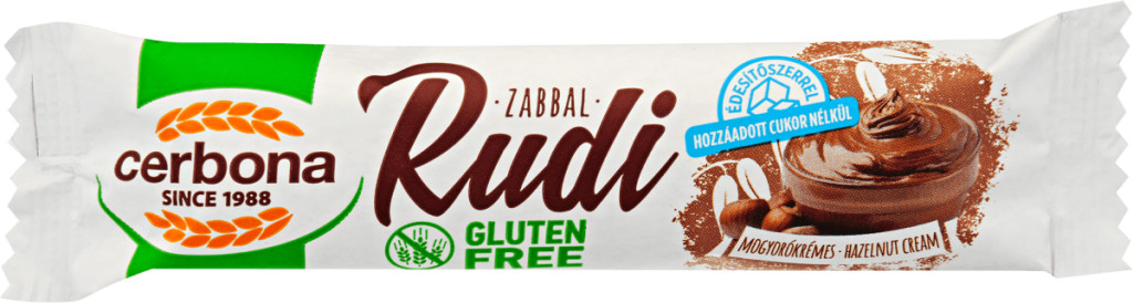 A Cerbona Rudikat a kakaóba vont, puha zabpehely és az isteni töltelék tesz ellenállhatatlanná. A glutén- és laktózmentes, Mogyorókrémes Rudi, hozzáadott cukor nélkül készül, így azok is fogyaszthatják, akik odafigyelnek a cukor bevitelre. Értékes tápanyag-összetételű, élelmirost-forrás, ezáltal jól beilleszthető az egészséges táplálkozásba. Könnyen magaddal viheted és bárhol fogyaszthatod.