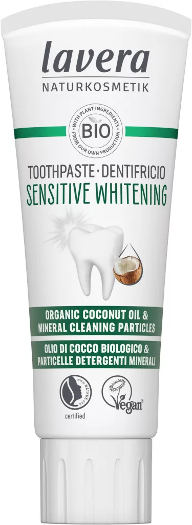 lavera BASIS Sensitive Fogkrém whitening szódium-fluoriddal és bambusz cellulóz tisztító részcskékkel. Green strong&white complex-szel (új formula aktív összetevőkkel) 5in1 védelem: eltávolítja a lepedéket, véd a fogszuvasodás ellen, megelőzi a fogkőlerakódást, védi a fogínyt, friss leheletet biztosít és kíméletesen fehérít. Összetevők: Sorbitol, Aqua, Hydrated Silica, Glycerin, Xylitol, Sodium Coco-Sulfate, Sodium Lactate, Cl 77891, Aloe Barbadensis Leaf Juice**, Cocus Nucifera Oil **, Salvia Officinalis Leaf Extract**, Mentha Piperita Oil**, Xanthan Gum, Cellulose, Sodium Fluoride, Menthol, Aroma***, Limonene*** (**ellenörzőtt ökológiai termesztésből ***természetes esszenciális olajok)