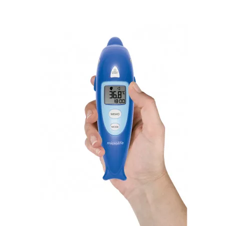 A MICROLIFE NC400 típusú infrás lázmérő, infravörös homlokhőmérő a svájci MICROLIFE cég klinikailag tesztelt hőmérője. Rendkívül gyors, 3 másodpercen belüli mérés. A MICROLIFE NC400 egy testtel nem érintkező infrás hőmérő, így környezeti és felületi hő mérésére is alkalmas. Könnyen leolvasható, nagyméretű LCD kijelző, amely láz esetén piros fénnyel jelez. A készülék 30 férőhelyes memóriával rendelkezik. Gyermekbarát delfin forma, ki-be kapcsolható hangjelzés.