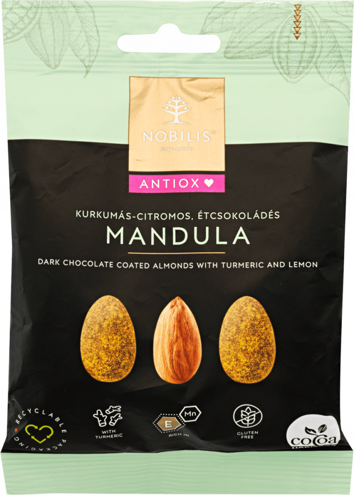 Összetevők: Étcsokoládé (min. 60%) (kakaómassza, cukor, kakaóvaj, emulgeálószer (szójalecitin), természetes vanília aroma) pörkölt, hántolatlan mandulabél Kurkuma (2%) Citromolaj (0,2%) Gyömbér