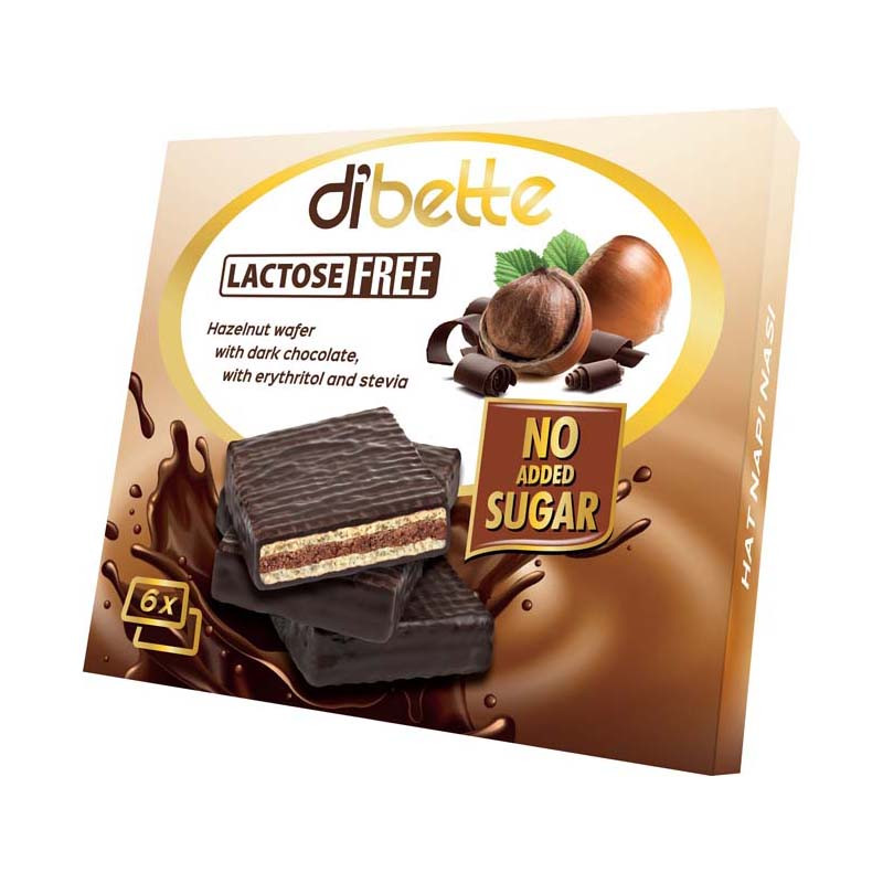Dibette NAS étcsokoládéval mártott, mogyorós krémmel töltött ostyalapocskák hozzáadott cukor nélkül, laktózmentes, édesítőszerekkel 96g Eritrittel, 100g termékben: Energia tartalom: 1816/438, zsír 32,5 , telített zsírs. 19,2g, szénhidrát 50,7g, amelyből cukor 2,5g, poliolok 25g, rost 5,7g, fehérje 7,7g, só 0,1g