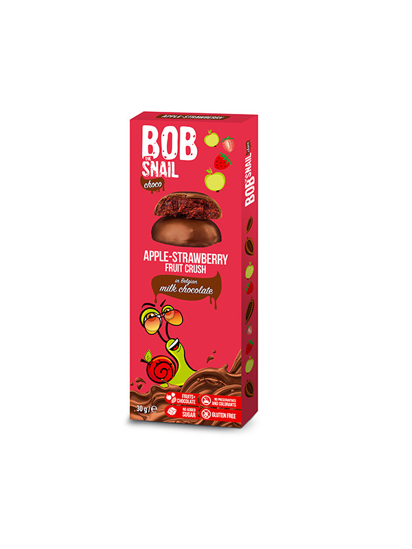 A Bob Snail újdonsága a csokoládéba mártott gyümölcs snack. A belseje 100% préselt gyümölcs, amelyet Belga tejcsokoládéba mártottunk. A csokoládé sem tartalmaz cukrot, stevia kivonattal van édesítve. Egészséges finomság az egész családnak!