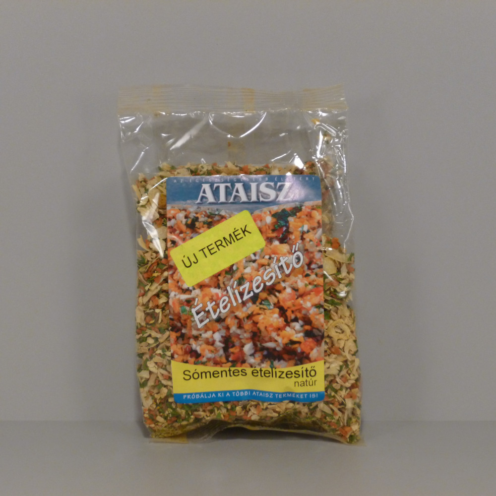 Ataisz sómentes ételízesítő 200gKizárólag őrölt és aprított zöldségekből és fűszerekből áll, mindennemű adalékanyagtól mentes. Kurkumával színezve. Felhasználási javaslat:A termék kiválóan alkalmas levesek, főzelékek, pástétomok ízesítésére, de bátran alkalmazható szószokhoz, öntetekhez. A termék hozzáadott sót nem tartalmaz!Allergén információ:A termék zellert tartalmaz. Zabot, glutént és olajos magvakat is felhasználó üzemben készült. Átlagos tápanyagtartalom 100 g termékben:Energia tartalom: 1413,19 KJ/ 337,61 kcal Zsír: 1,46 g, -amelyből telített zsírsavak: 0,10 g Szénhidrát: 76,74 g, -amelyből cukrok: 44,80 g Fehérje: 12,44 g, Só: 0,12 gÖsszetevők:aprított, szárított zöldségek: sárgarépa, paszternák, petrezselyemgyökér, zeller gumó és levél, vöröshagyma, fokhagyma, petrezselyem levél (EU), kurkuma (India)Száraz, hűvös helyen tárolandó.