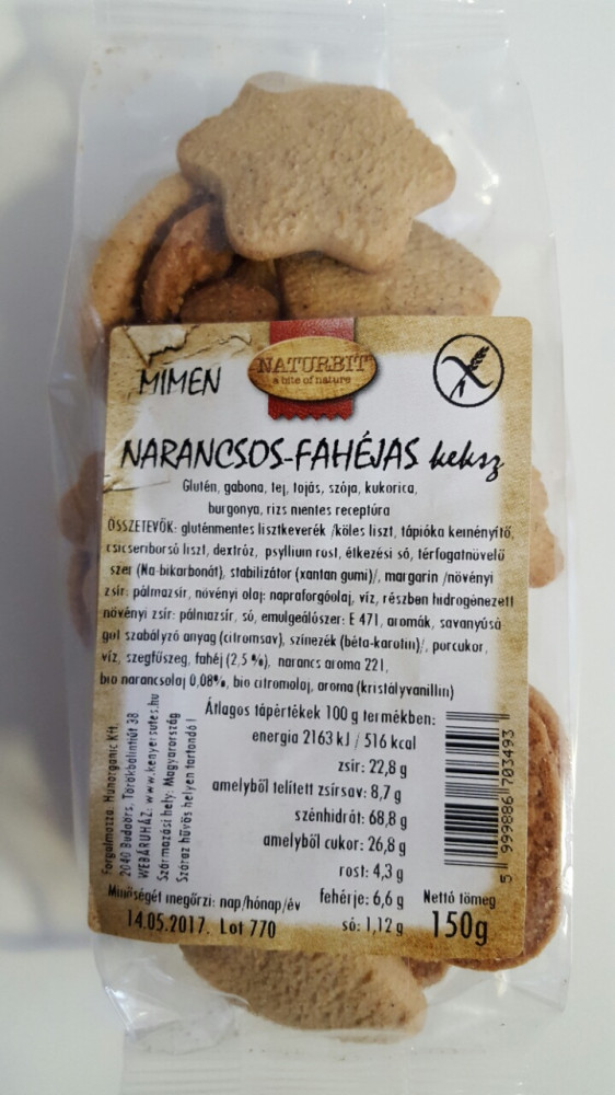 gluténmentes lisztkeverék hajdina liszt, tápióka keményítő, csicseriborsó liszt, dextróz, psyllium rost, étkezési só, térfogatnövelő-szer (Na-bikarbonát), stabilizátor (xantan gumi)/, margarin /növényi zsír: pálma zsír, növényi olaj: napraforgóolaj, víz, részben hidrogénezett növényi zsír: pálmazsír, só. emulgeáló szer: E 471, aaromák, savanyúságot szabályozó anyag (citromsav), színezék (béta-karotin)/, porcukor, víz, szegfűszeg, fahéj (2,5%), narancsaroma 221, bio narancsolaj 0,08%, bio citromolaj, aroma (kristályvanillin).