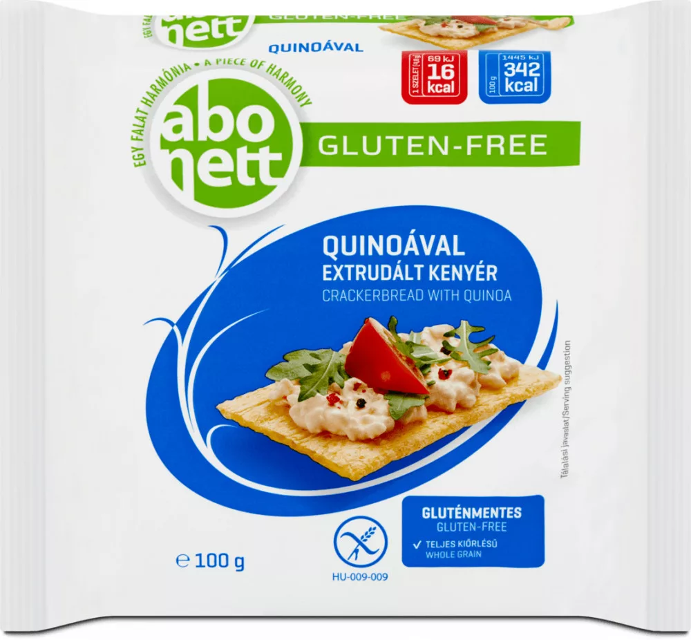 Abonett gluténmentes extrudált kenyér, quinoával általános emberi fogyasztásra, élelmi rostban gazdag, ropogós finomság. Kiváló alap a legkülönbözőbb feltétekhez (pl.: felvágottak, sajtok, dzsemek, szendvicskrémek, zöldségek, halkészítmények).