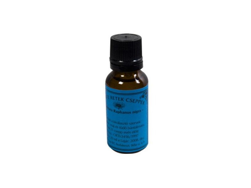 A bio-elixir eljárással készült retekcsepp: információ hordozó és a fekete retek minden hatóanyagát tartalmazza. Étkezés elott történő kúraszerű alkalmazása: a tipusos vese- és epekövet, valamint lerakódásokat feloldja. A máj, az epe és a vese vezetékeiből a flakkonokat / homokot feloldja. A kivonat enyhe étvágytalanságot okoz, csökkenti a kiválasztó szervek gyulladásait és a nyirokcsomók duzzanatait.