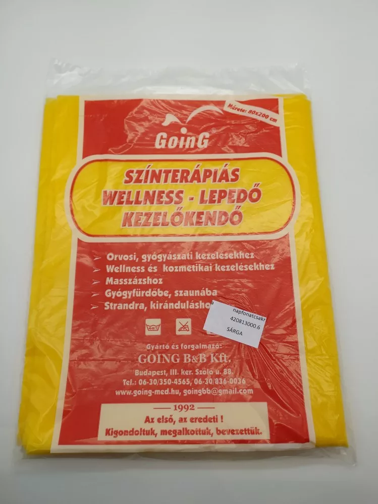 A Going színterápiás wellness lepedő használata a szakmai és magán felhasználók számára az egyéni higiénia biztonság nyújtása mellett környezettudatos alkalmazásával az alábbi terletekre ajánlott: -orvosi, gyógyászati kezelésekhez, -wellnss és kozmetikai kezelésekhez, - masszázshoz, - gyógyfürdőbe, - strandra (fűre, nyugágyra terítve), - kiránduláshoz. Színeinek hatása kedvezően hat a kedélyállapotra, hangulatra, egészségi állapotra. Mérete: 80 cm X 200 cm. Anyaga: bőrbarát, textil hatású nem szőtt szövet, 100% PP újrahasznosítható!