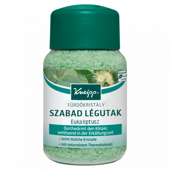 A Kneipp Szabad légutak Fürdőkristály természetes termálsóból készül és értékes eukaliptusz illóolajat tartalmaz. A Kneipp fürdőkristályok tiszta termálsóját az Európában egyedülálló Saline Luisenhall természetes sókészletéből nyerik évszázados hagyományokat követve. A sókristályokat értékes aromaaktív olajokkal vonják be. A termálsó nem tartalmaz kémiai és környezetszennyező anyagokat. Bőrgyógyászatilag tesztelt, pH bőrsemleges, tartósítószert és alkáli szappant nem tartalmaz. Aromahatás: az eukaliptuszolaj átmelegíti a testet és felszabadítja a légutakat.