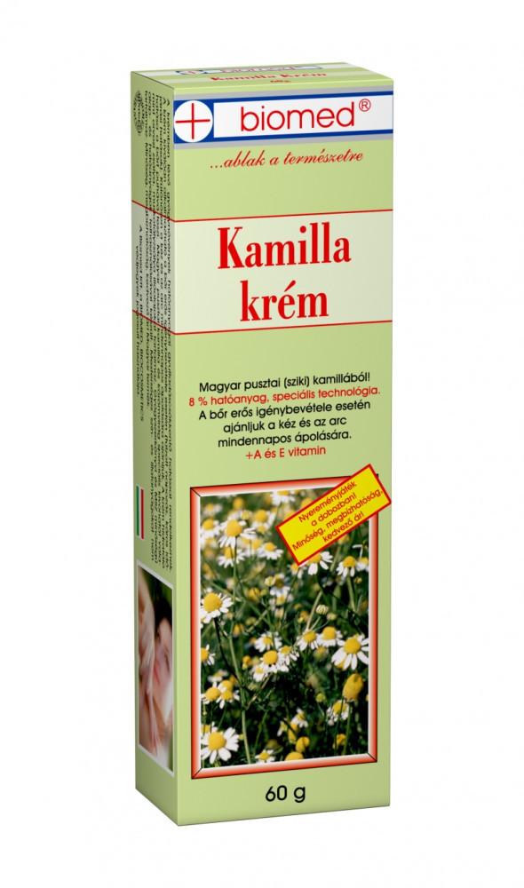 Biomed Kamilla Krém 60 g A magyar sziki kamilla hatóanyag összetétele kedvezőbb, mint a termesztett kamilláé, ezen tulajdonsága miatt erősebb gyulladáscsökkentő hatással rendelkezik. ' - ezért termékünkben csak sziki kamillát használunk fel. A krém kiválóan alkalmazható a bőr erős igénybevétele esetén (túlzott napozás, káros időjárási hatások).
