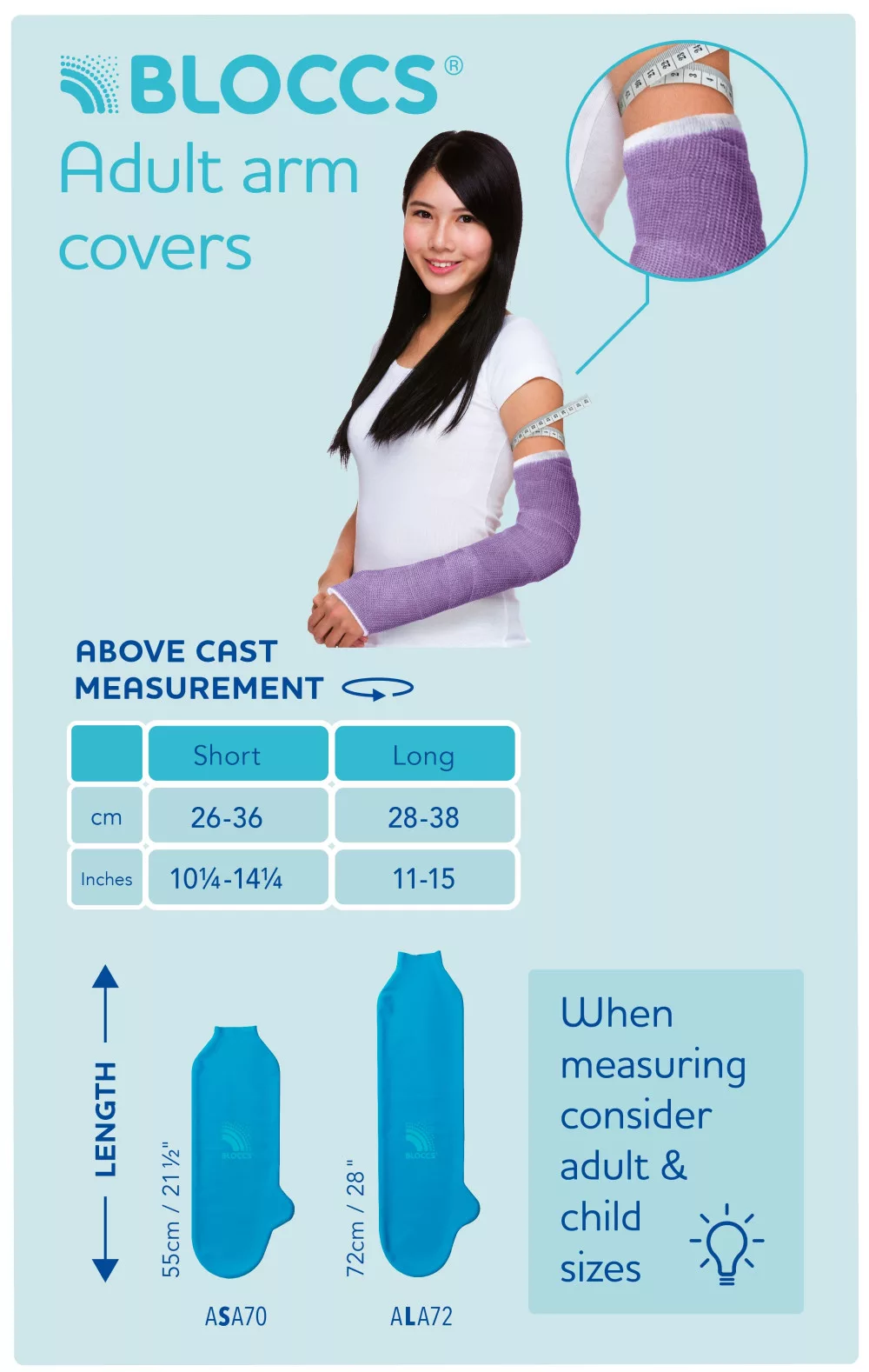 Az „A” jelölés mutatja meg az ábrán a hosszúságot, „B” jelölésű mutatja meg az ábrán a kerületet. A tökéletes méret megtalálásához mérje meg a láb vagy a kar kerületét 2,5-5 cm-re a gipsz (kötés) felett, illetve a kötés hosszát. A méretek 1-2 cm-el eltérhetnek. A gipszvédő könnyedén nyújtható, a gipszen vízhatlan réteget képezve. A 13-14 év felettieknek a felnőtt méreteket ajánljuk.